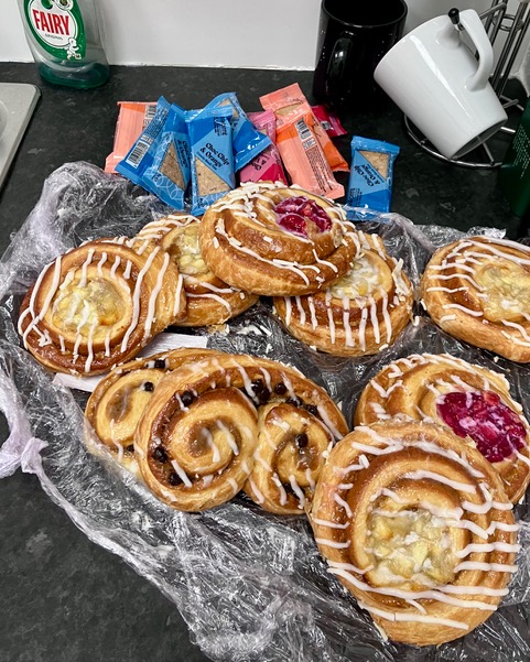 We have some pastries and biscuits left over from a staff event. They are in the kitchen — help yourselves!