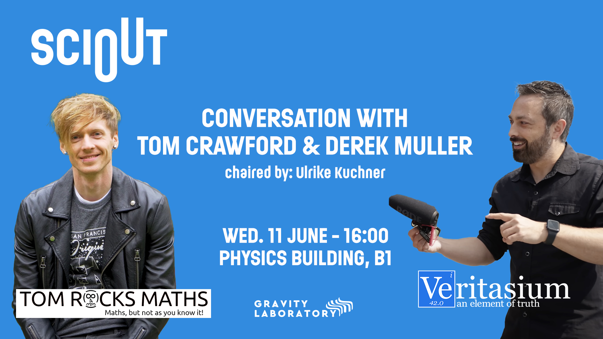 The SciOUT organising team is excited to invite you to a public talk featuring our guests, Derek Muller (from Veritasium) and Dr. Tom Crawford (@TomRocksMaths). This event will take place on Wednesday the 11th of June, at 4:00 pm in Room B1 of the Physics building.
